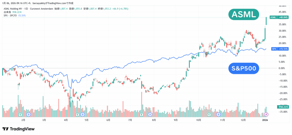 半導体製造装置最大手のオランダASMLホールディングス(ティッカーシンボル:ASML)株が堅調に推移しています。過去1年間では40.8%高と、多くの機関投資家が参照するS&P500(15.5%高)を上回っている状況です(1月5日時点)。
