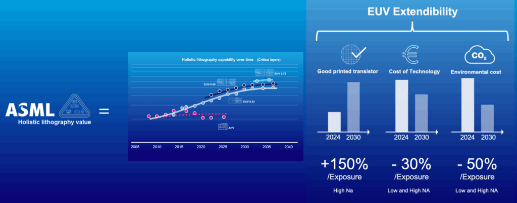 ASMLは2030年代に開口数を0.75に高めるとともに、NA0.55の装置は2027年、0.75の装置は2035年ごろから量産に使われると見込んでいます。技術開発を推進することで、より低コストかつ低エネルギーの超小型トランジスタを形成し、さらなる収益拡大を図れるでしょう。