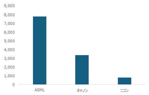 露光市場で9割強の市場シェアを握るのがASMLです。2000年代以前に世界を席巻したキャノン(銘柄コード:7751)とニコン(7731)は、それぞれ4.6%、2.6%を占めるにすぎません(出所:経済産業省)。ASMLは強固なビジネスモデルの下、EUV露光装置の開発を成功した唯一の企業として露光分野における技術的優位性を確立しています。
