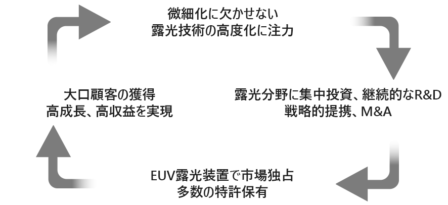 同社は半導体の微細化に欠かせない露光分野へ集中投資を行い、露光装置市場で約9割の市場シェアを握るとともに、最先端半導体の量産に必須の極端紫外線(EUV)露光装置で市場を独占している状況です。事業で得られた資金を露光技術のさらなる高度化に投じて技術的優位性を高め、高収益体質を維持するビジネスモデルを構築しています。