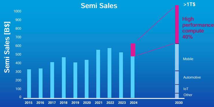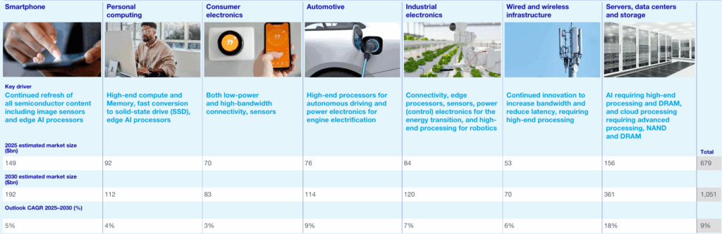 半導体業界は引き続き堅調であり、AIがさらなる機会を創出すると予想されています。世界の半導体売上高は2025年から2030年にかけて9%の年平均成長率(CAGR)で成長し、2030年までに1兆ドルを突破すると見込まれています。