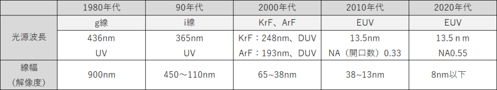 光源波長がより短くなるほど半導体の微細な回路パターンを形成できます。ASMLは365ナノメーター(nm)の紫外線(UV)を用いた「i線」から始まり、248nmの「フッ化クリプトン(KrF)」を用いた深紫外線(DUV)システム、193nmの「フッ化アルゴン(ArF)を用いたシステムを投入してきました。