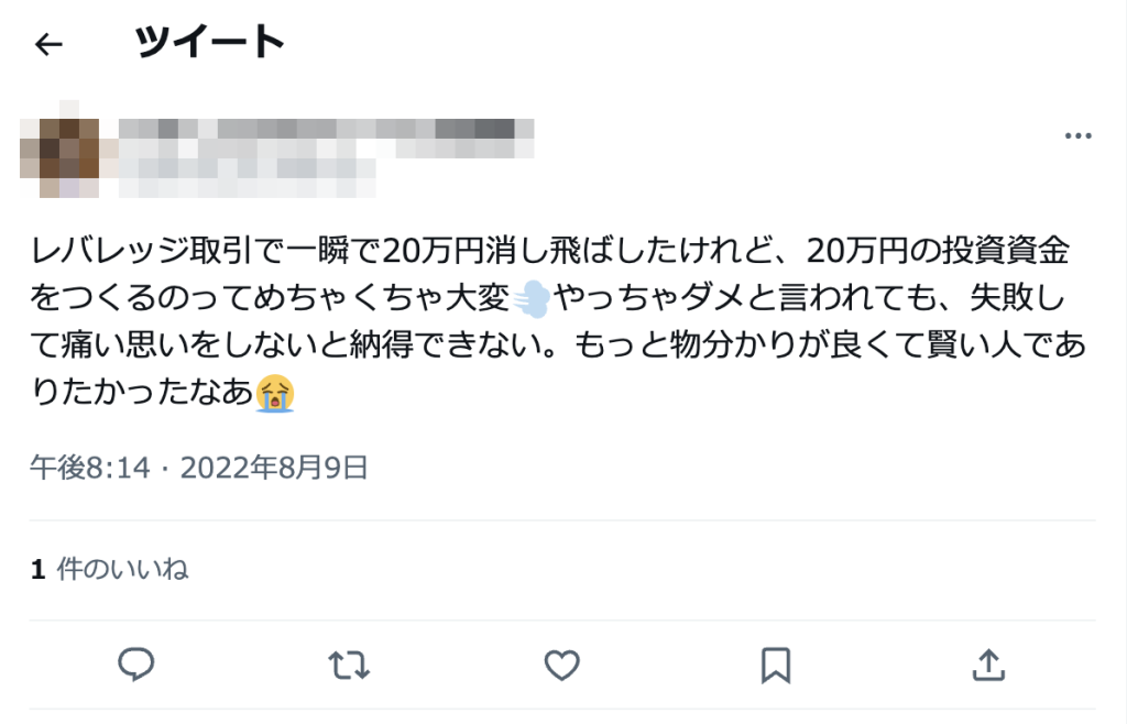 この方はSNSで、レバレッジ取引で20万円の損失を出してしまったと公表しています。