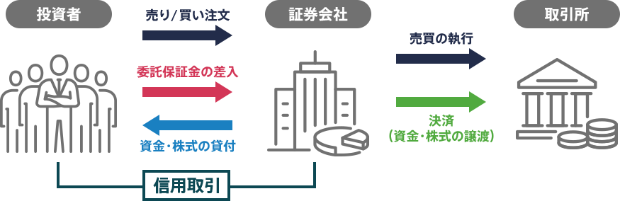 投資者が証券会社に委託保証金を差し入れて、資金や株式を借りて行う売買取引